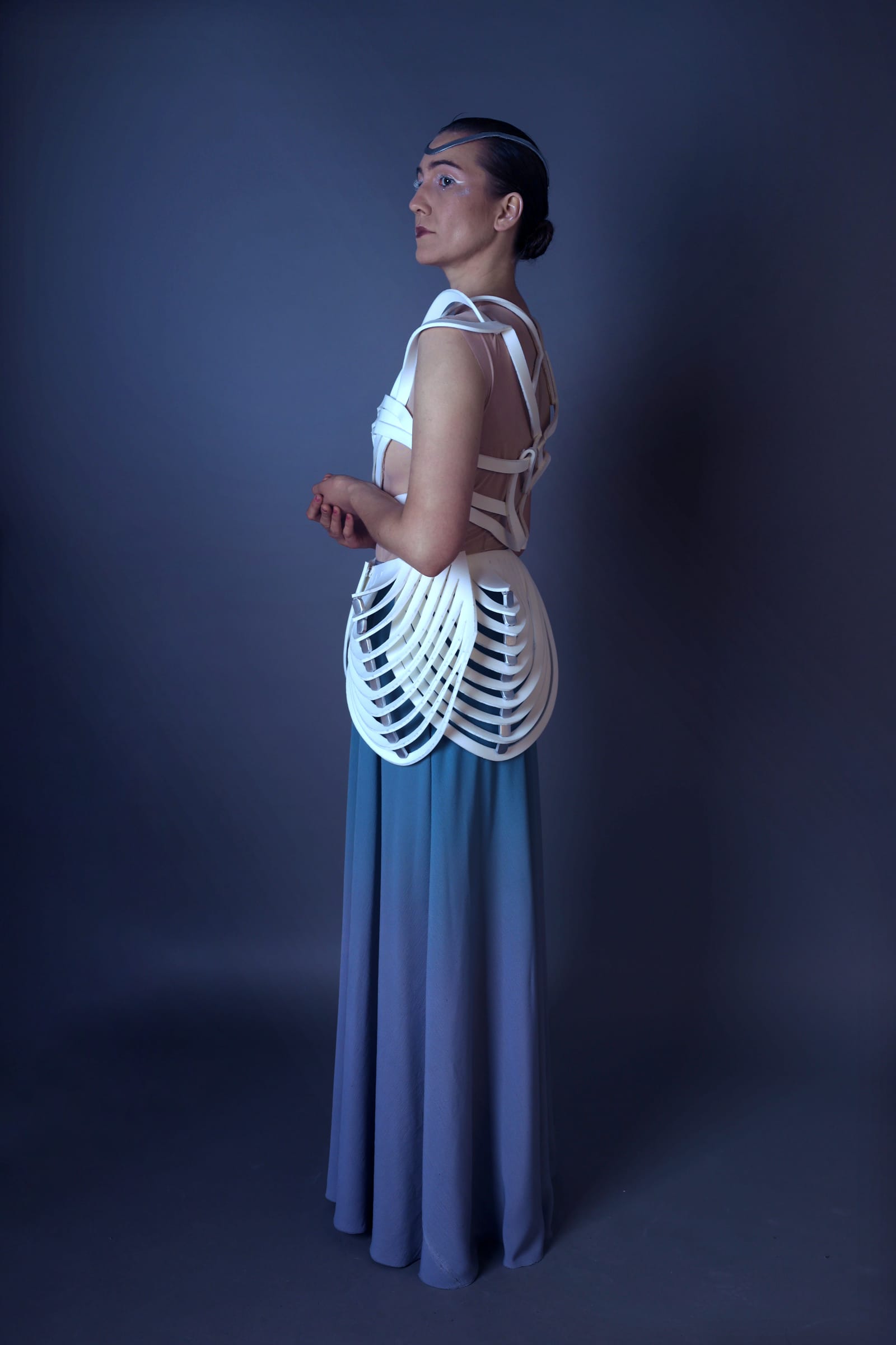 Transparenz erscheint hier nicht als vollständige Sichtbarkeit, sondern als kontrolliertes Offenlegen – ein Spannungsfeld zwischen Schutz und Leuchten. Das Objekt lässt sich wie ein Fragment einer möglichen Kultur lesen, in der Kleidung mehr ist als Hülle: eine formgebende Struktur, die den Körper neu definiert.