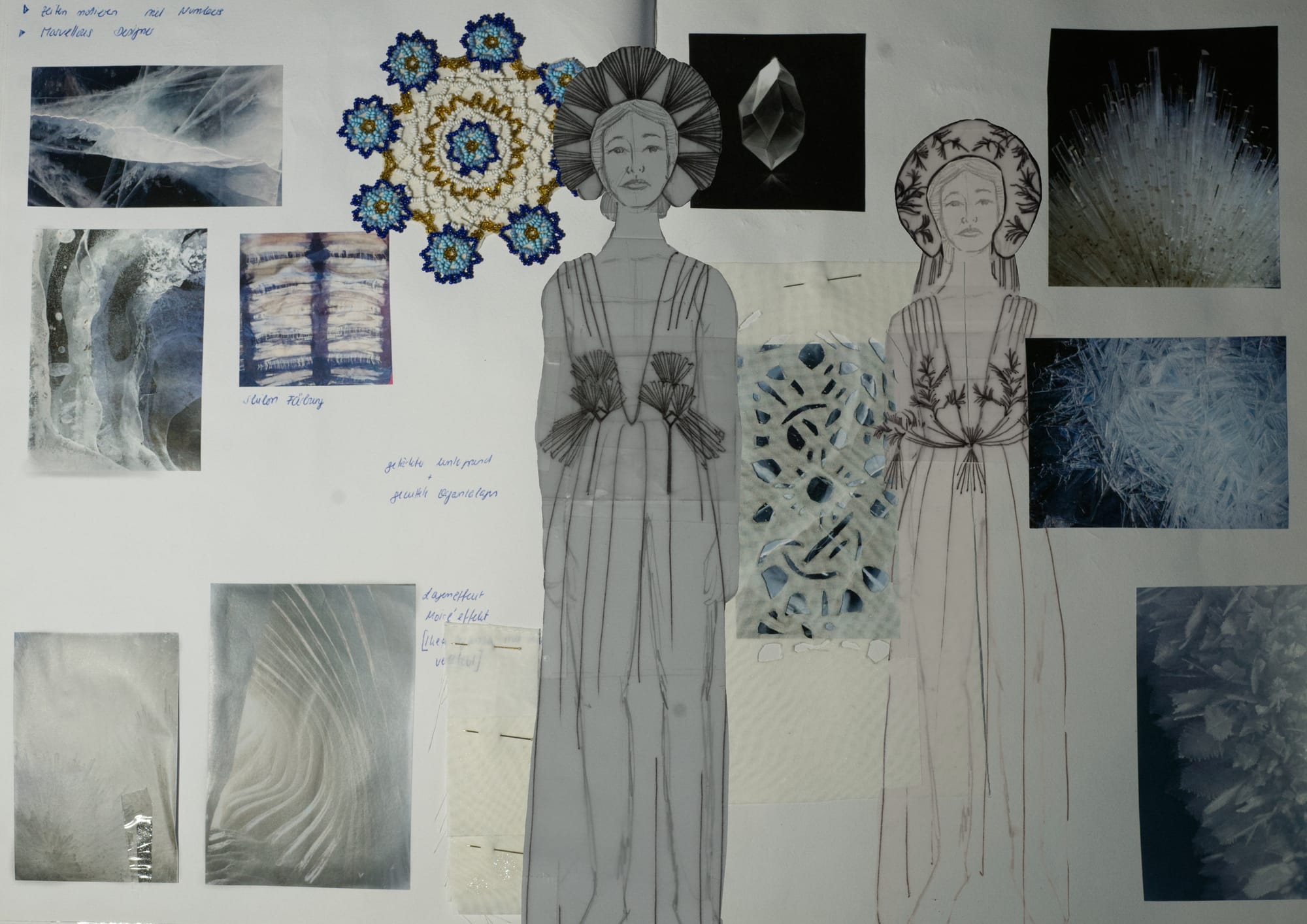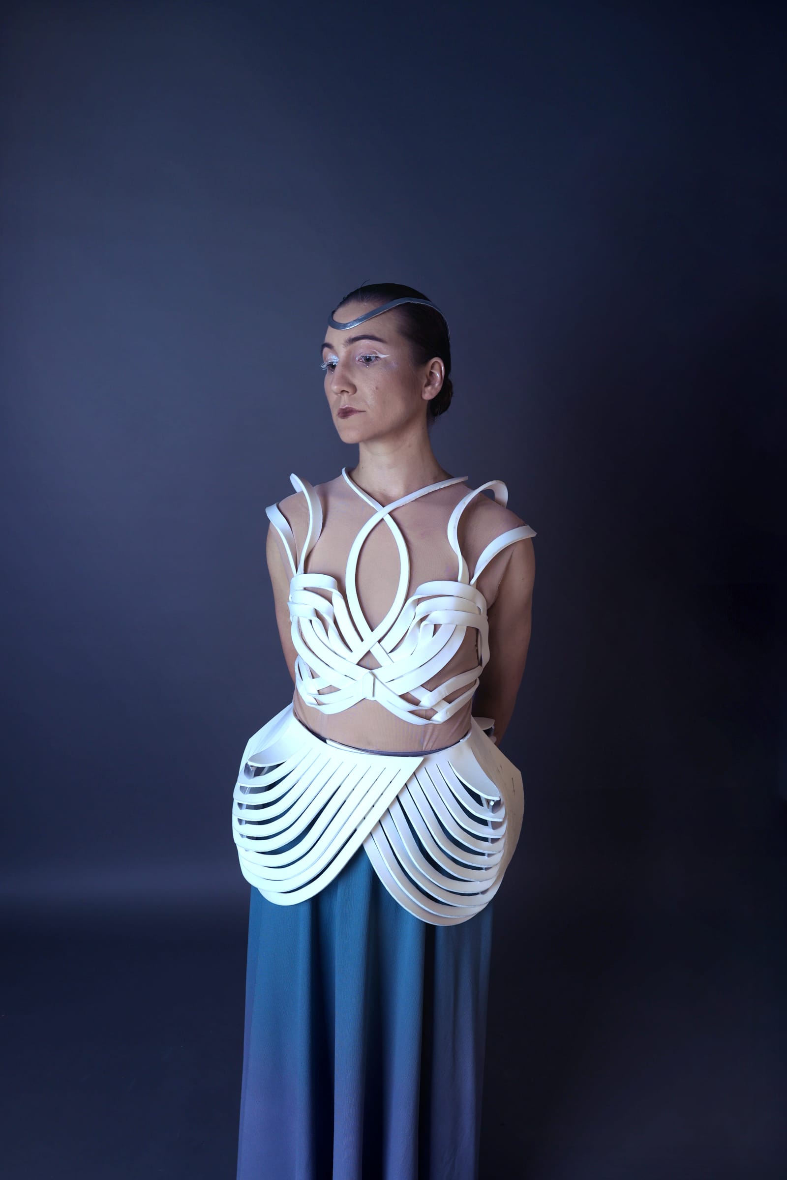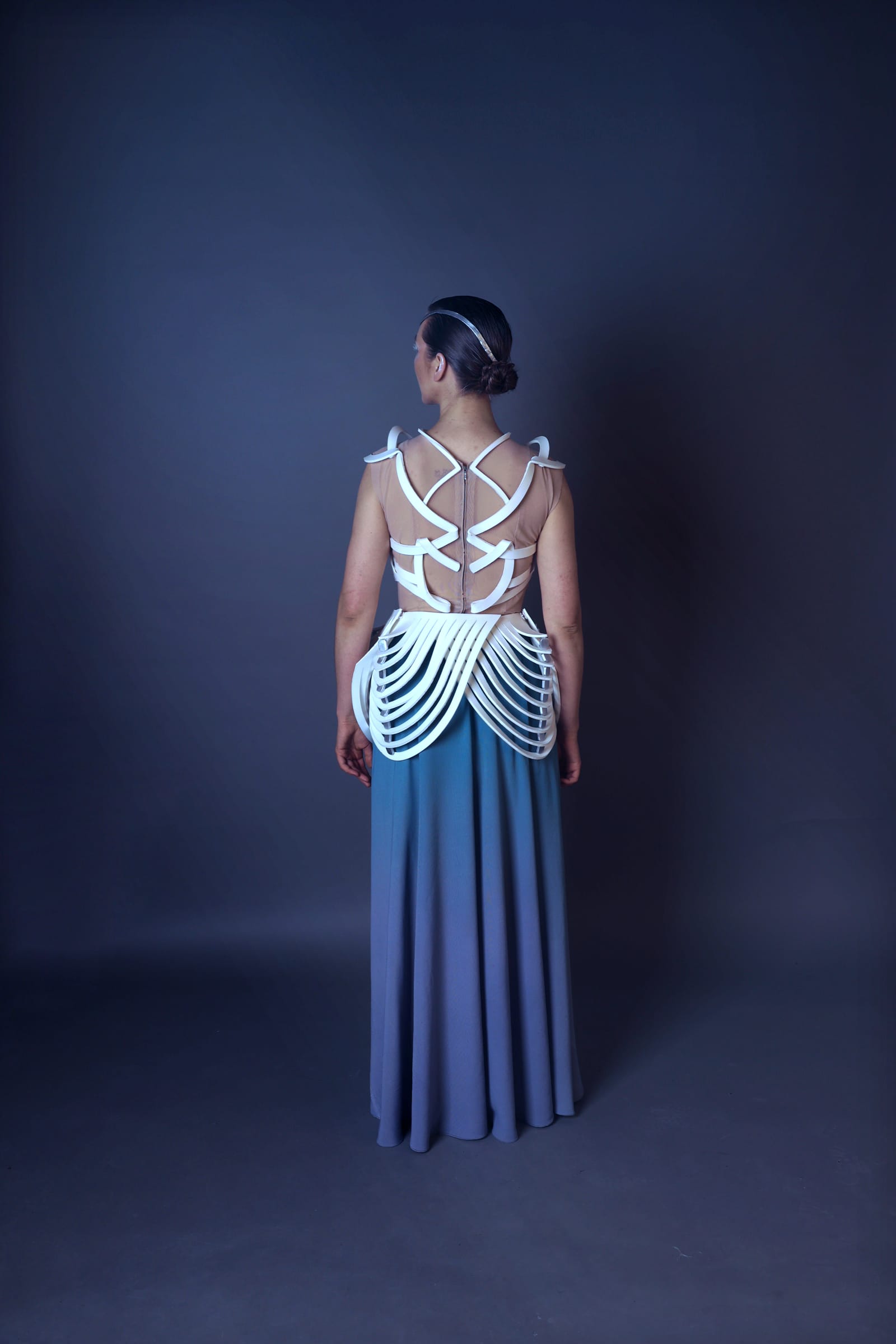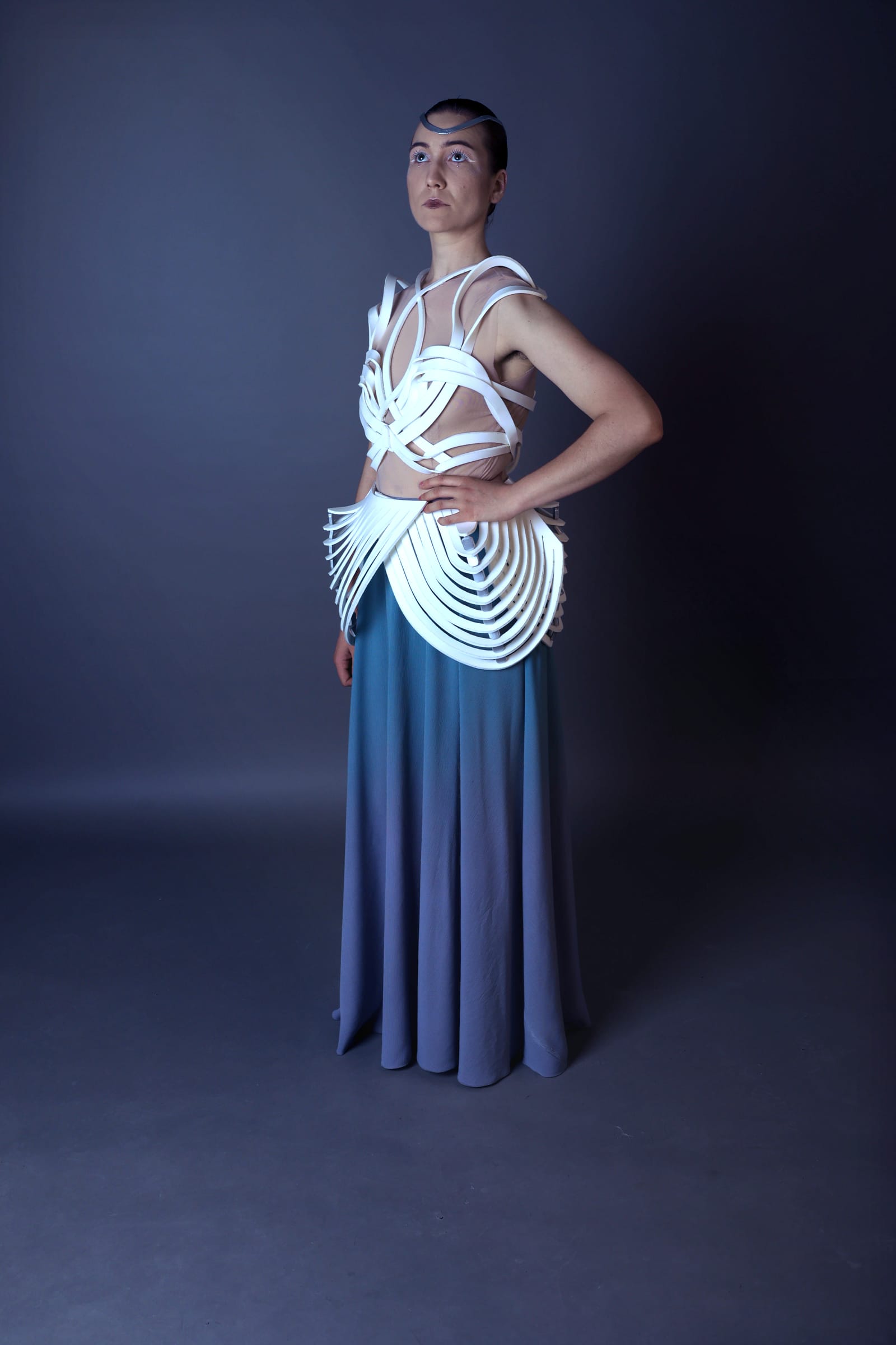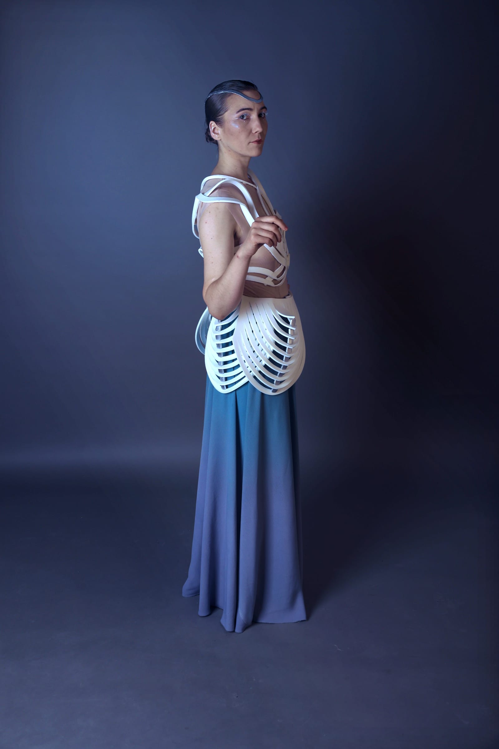 Zwischenlicht bewegt sich zwischen technischer Konstruktion und poetischer Form. Modulare elliptische Strukturen greifen Licht als gestalterisches Element auf und erinnern in ihrer kristallinen Ordnung an rituelle Ornamentik. Die sich verdrehenden Streifen umhüllen den Körper wie ein Exoskelett und zugleich wie durchlässige Lichtmembranen.
